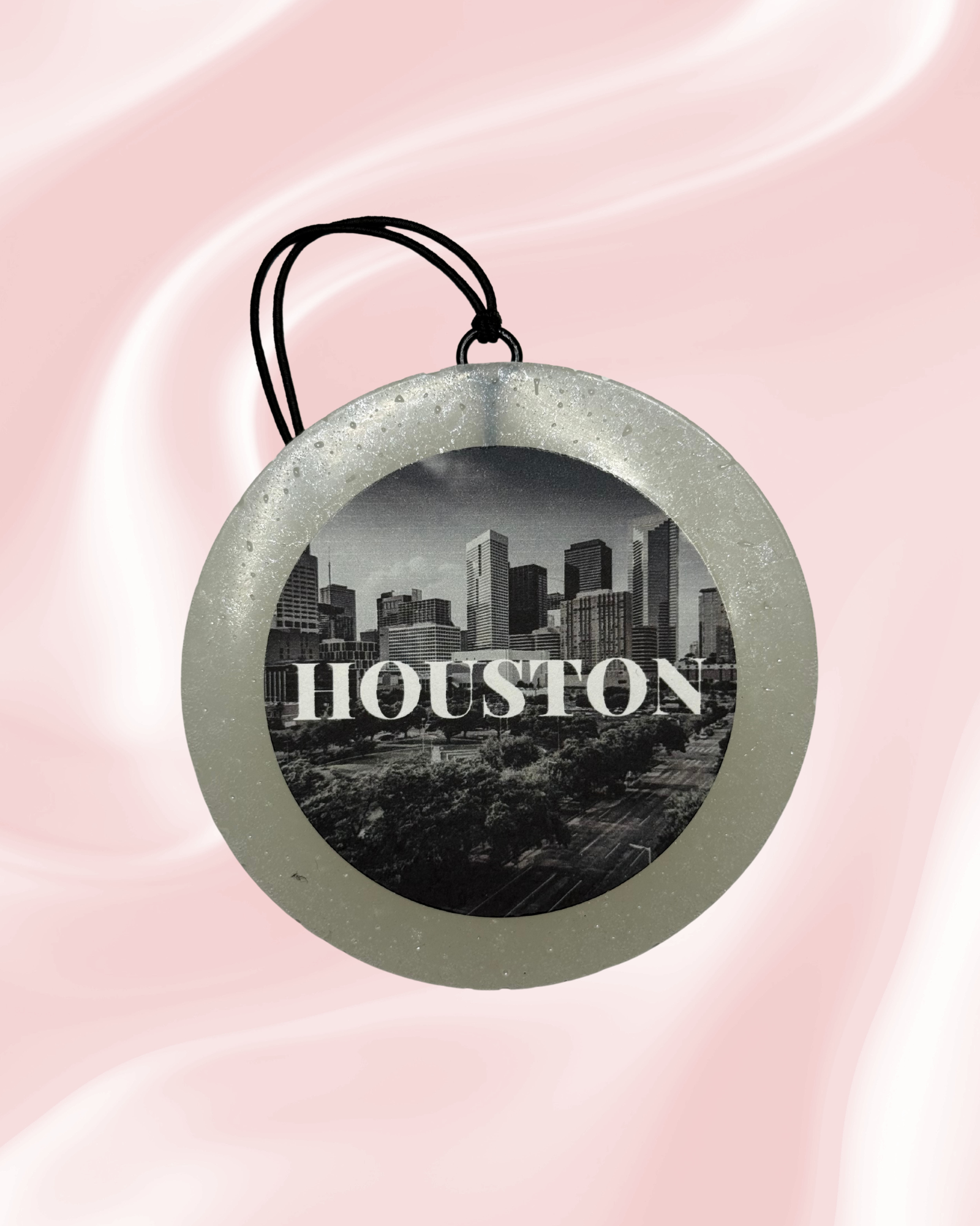 Handmade car freshie made with aroma beads infused with premium fragrance oils and decorated with mica and acrylic paint.