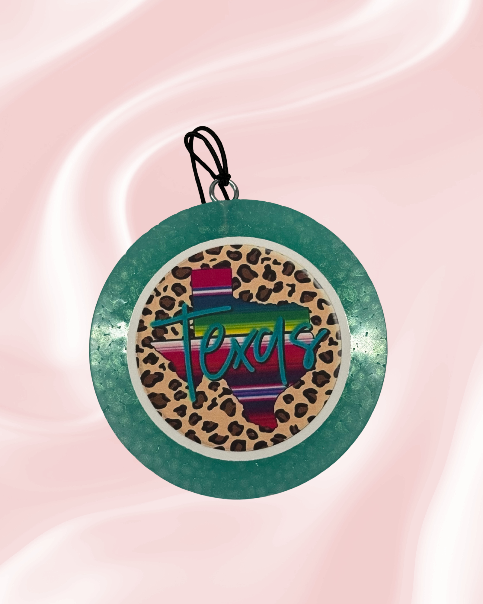 Handmade car freshie made with aroma beads infused with premium fragrance oils and decorated with mica and acrylic paint.
