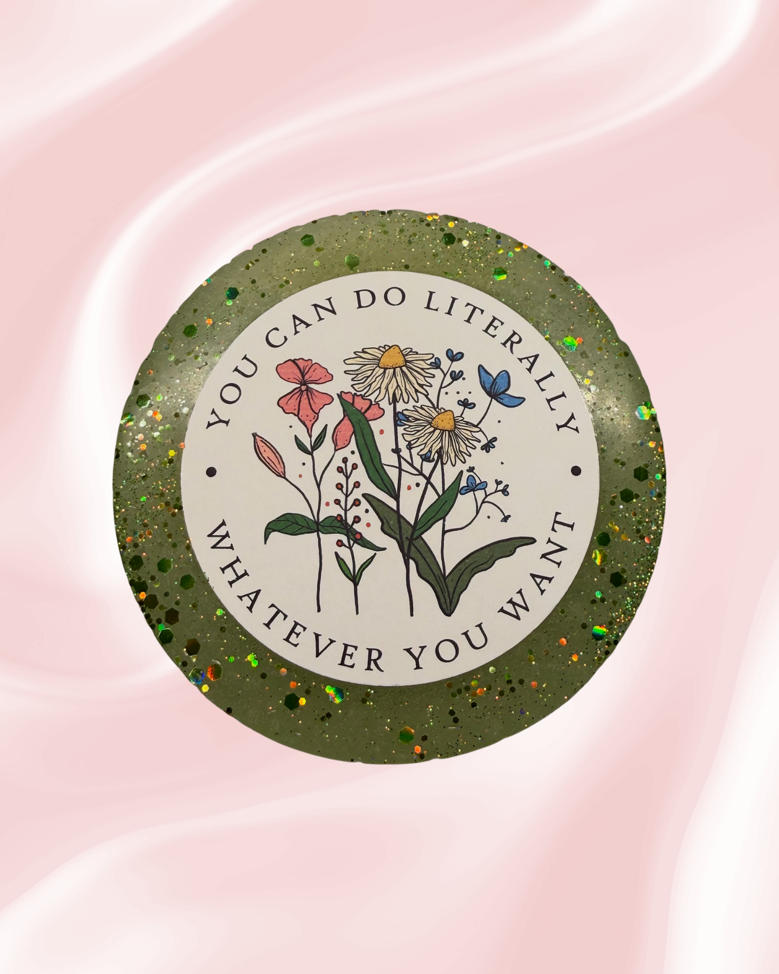 Handmade car freshie made with aroma beads infused with premium fragrance oils and decorated with mica and acrylic paint.